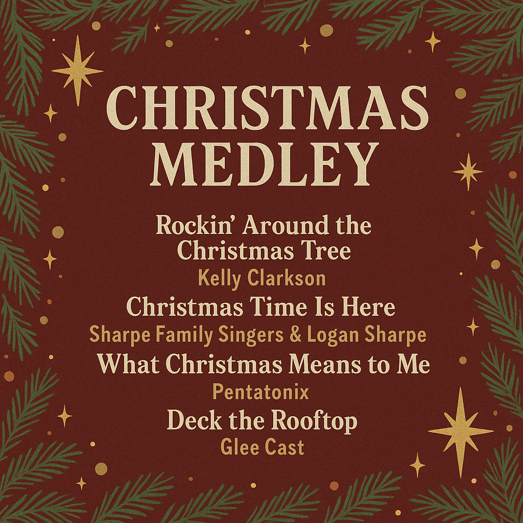 A Custom Christmas Medley featuring Rockin' Around the Christmas Tree by Kelly Clarkson, Christmas Time is Here by Sharpe Family Singers and Logan Sharpe, What Christmas Means to Me by Pentatonix, and Deck the Rooftop by Glee Cast.